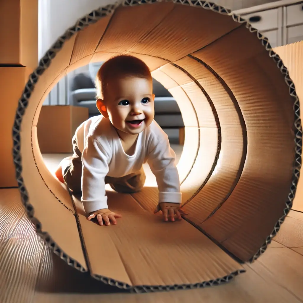 - 쿠션이나 박스를 이용해 작은 터널을 만들고 아기가 기어서 지나가도록 유도한다.